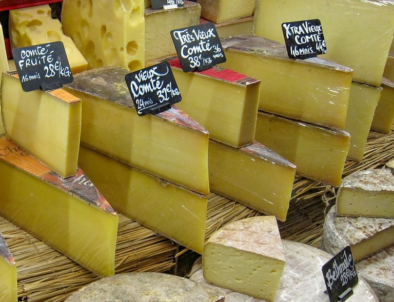 Comté is an Alpine cheese from the Jura Mountains, a region of eastern France. It was one of the first cheeses to receive Appellation d'Origine Contrôlée (AOC) recognition in 1958. This translates to "controlled designation of origin". This certification of authenticity clearly outlines manufacturing process regulations. At around 65,000 tonnes annually, it has the highest production of all PDO cheeses in France. Aging time, thus taste and texture, vary greatly from 4 to 36 months.