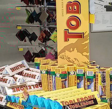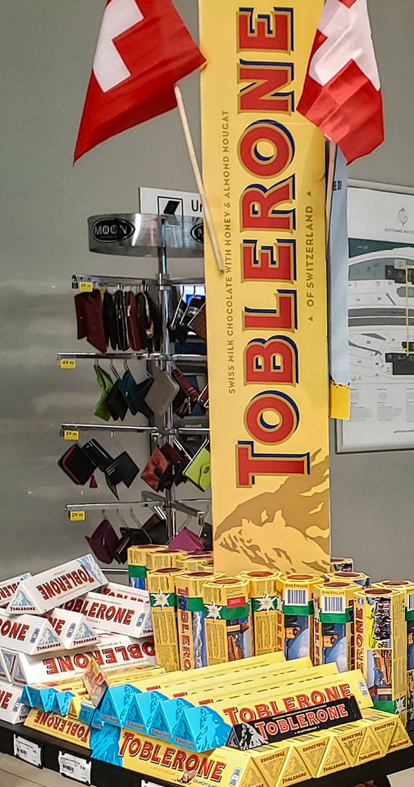 The popular Swiss chocolate Toblerone in variety of flavors for sale at a rest stop joint outside the Gotthard Tunnel