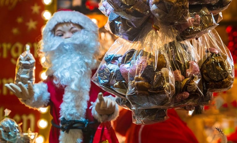 Germany, France, Austria, and other countries feature handmade chocolates at festive stalls during the holiday season.